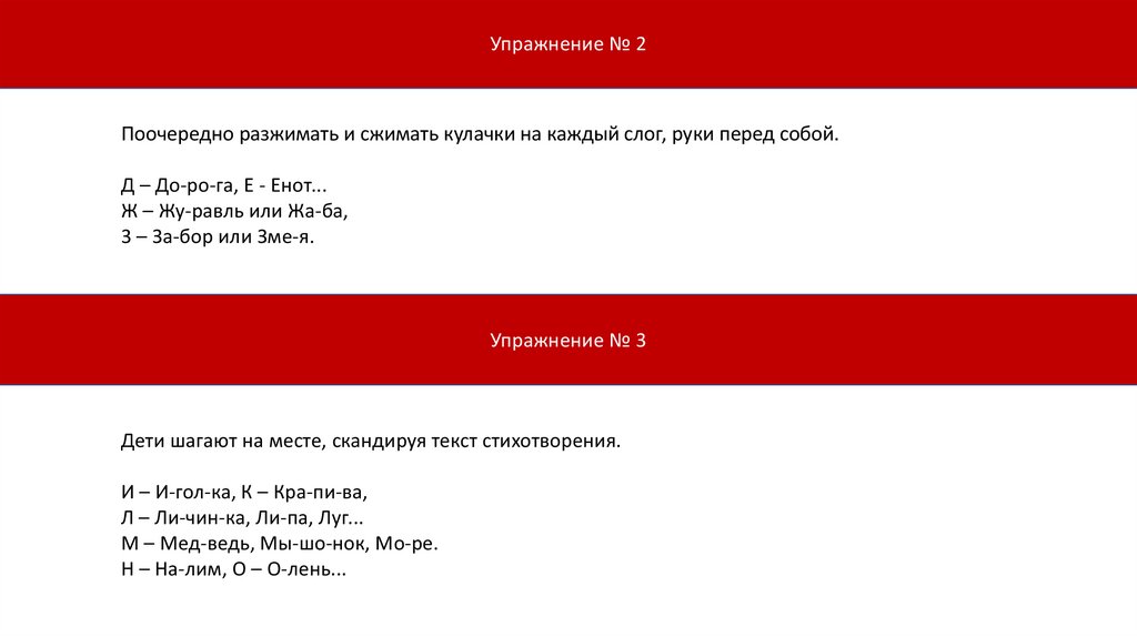 Упражнение № 2Поочередно разжимать и сжимать кулачки на каждый слог, руки перед собой.