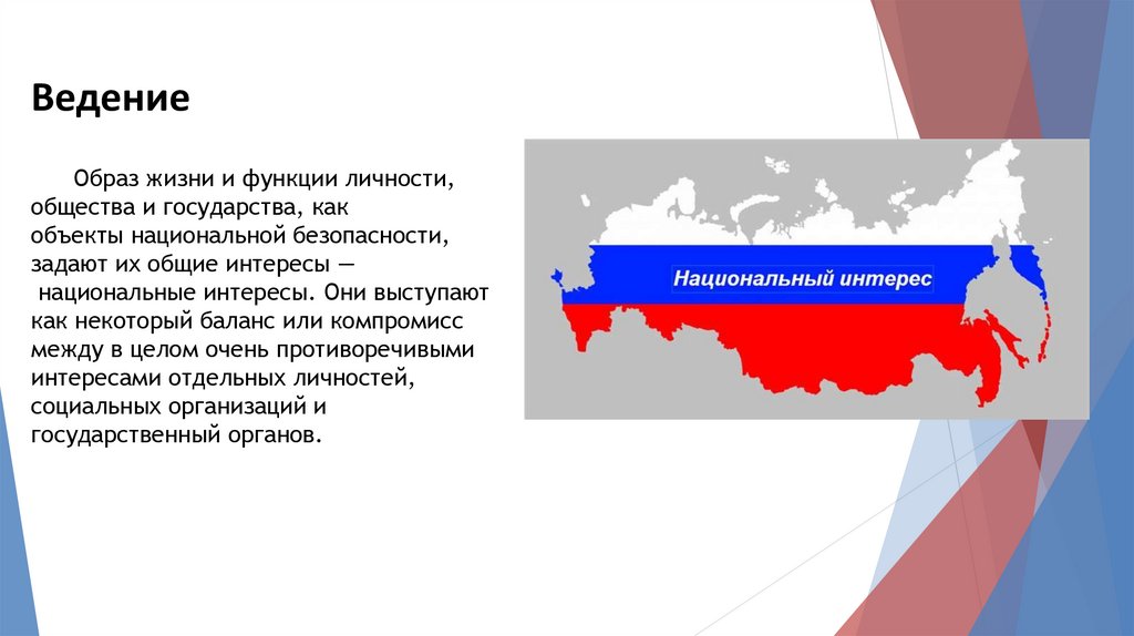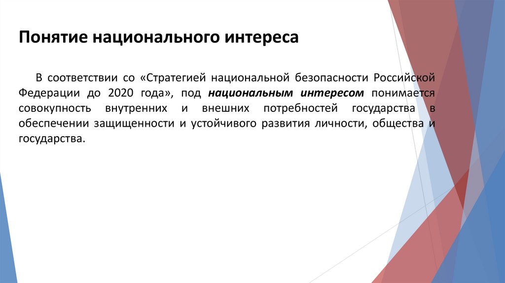 Понятие национального интересаВ соответствии со «Стратегией национальной безопасности Российской