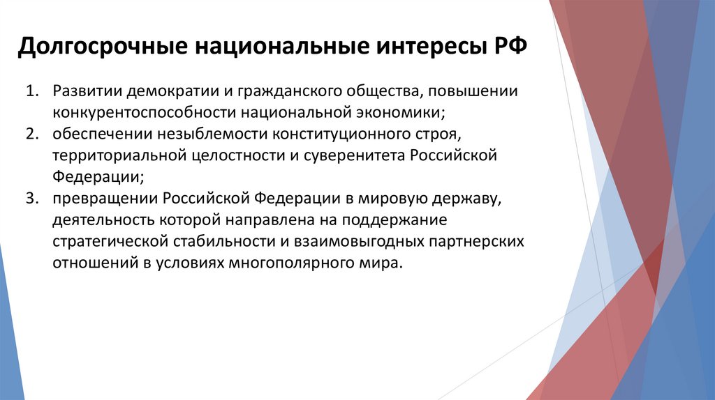 Долгосрочные национальные интересы РФ1. Развитии демократии и гражданского общества, повышении