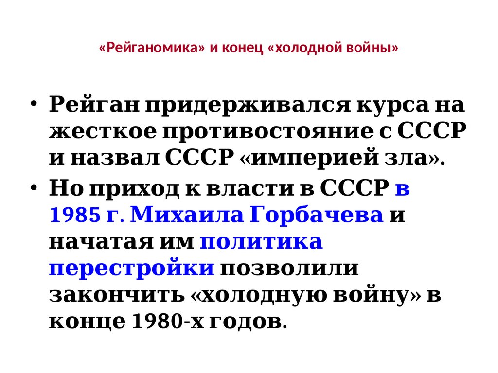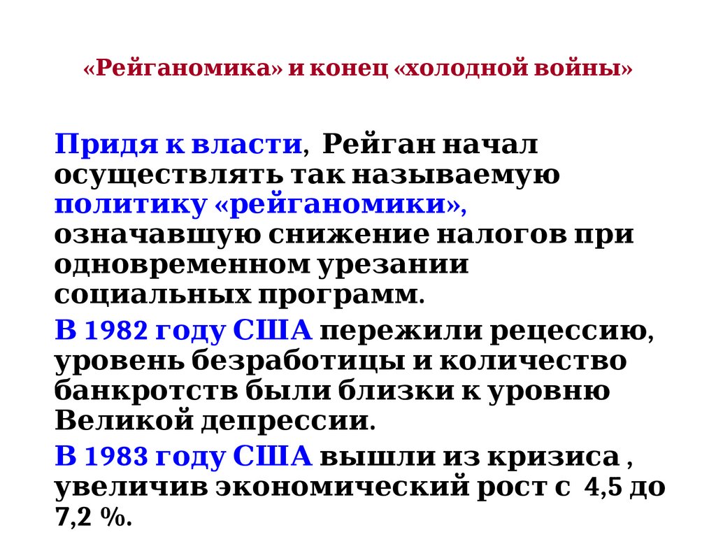 «Рейганомика» и конец «холодной войны»• Рей половине XX векага:н придержива:лся курса: на: