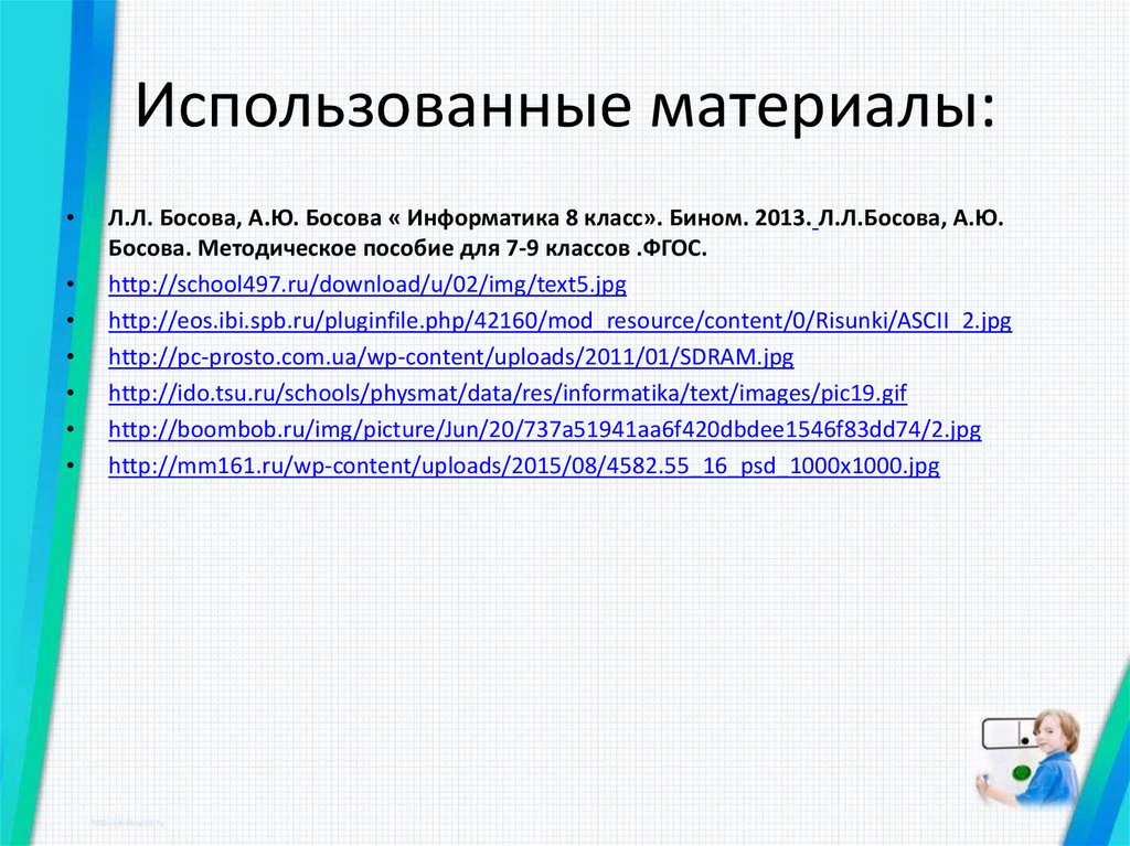 Использованные материалы:Л.Л. Босова, А.Ю. Босова « Информатика 8 класс». Бином. 2013. Л.Л.Босова, А.Ю.