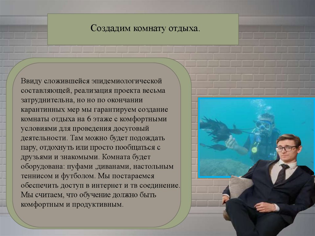 Создадим комнату отдыха.Ввиду сложившейся эпидемиологической