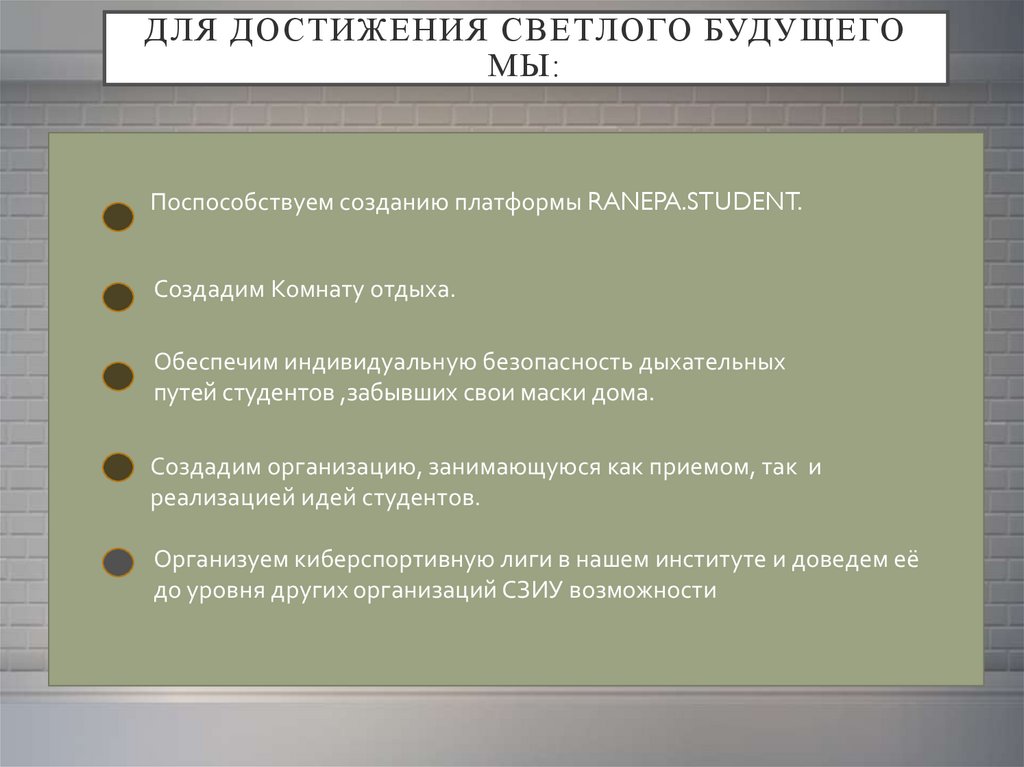 ДЛЯ ДО СТИЖЕНИЯ СВЕТЛОГО БУДУЩЕГОМЫ:
