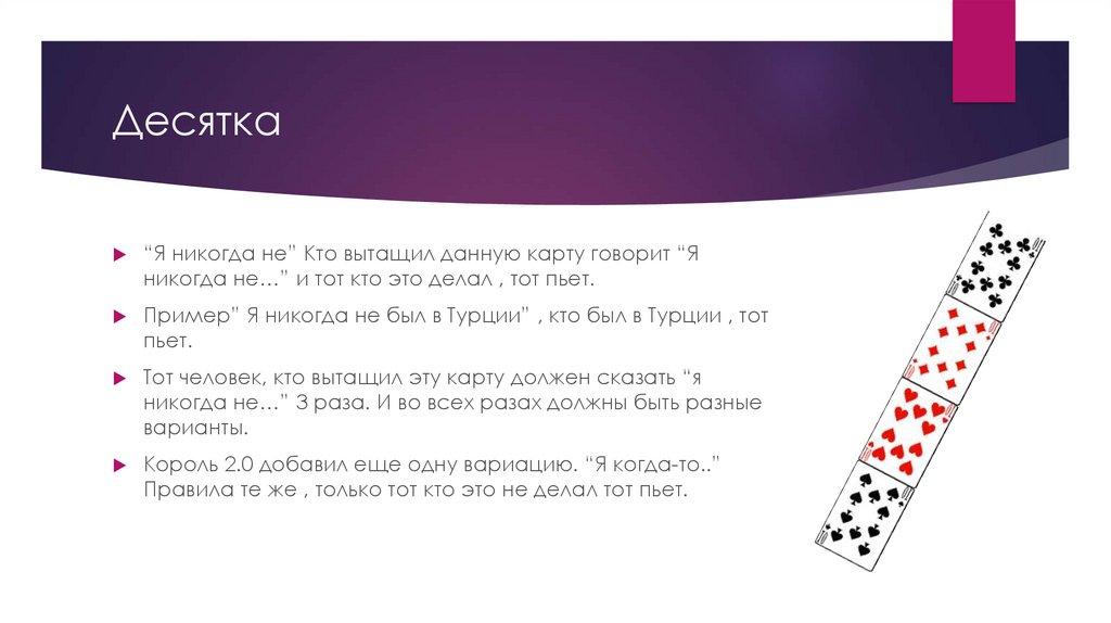 Десятка“Я никогда не” Кто вытащил данную карту говорит “Я