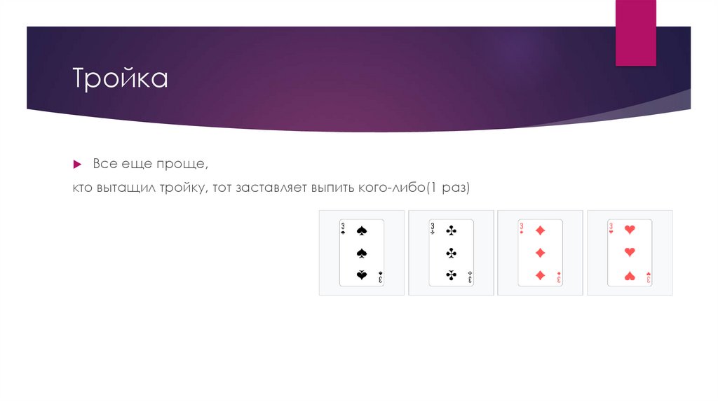 кто вытащил тройку, тот заставляет выпить кого-либо(1 раз)
