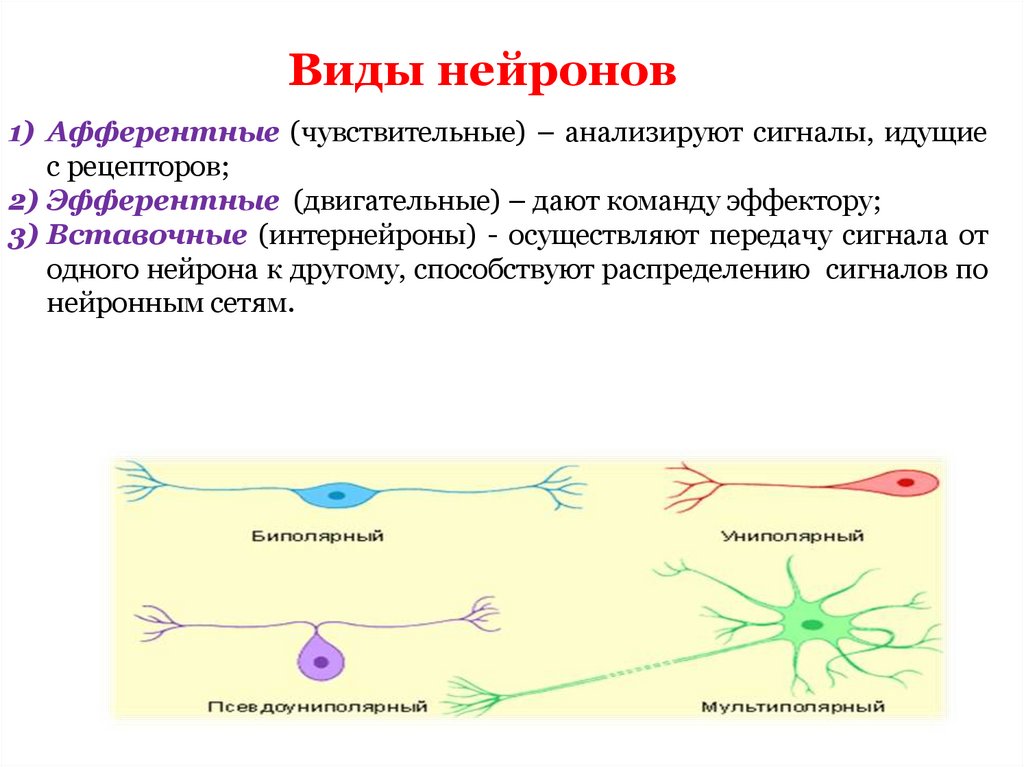 Виды нейронов1) Афферентные (чувствительные) – анализируют сигналы, идущие