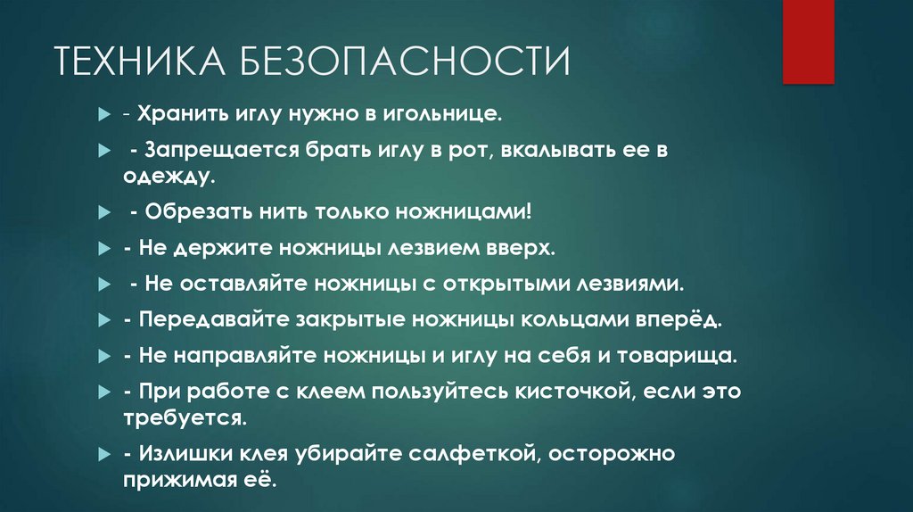 ТЕХНИКА БЕЗОПАСНОСТИ- Хранить иглу нужно в игольнице.