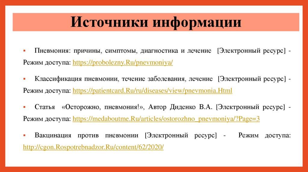 Источники информацииПневмония: причины, симптомы, диагностика и лечение [Электронный ресурс] -