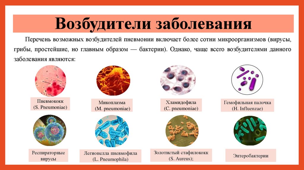Возбудители заболеванияПеречень возможных возбудителей пневмонии включает более сотни микроорганизмов (вирусы,