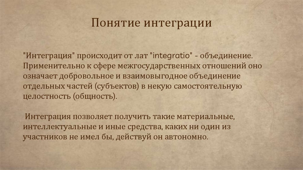 Понятие интеграции"Интеграция" происходит от лат "integratio" - объединение.