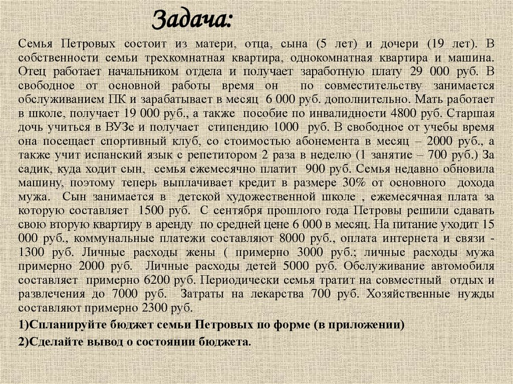1)Спланируйте бюджет семьи Петровых по форме (в приложении)