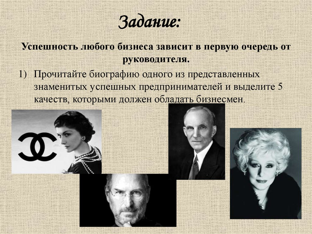 Задание:Успешность любого бизнеса зависит в первую очередь от