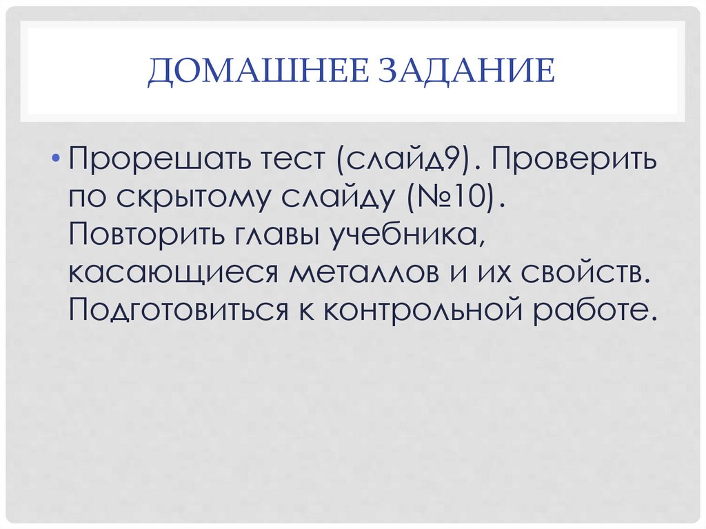 ДОМАШНЕЕ ЗАДАНИЕ• Прорешать тест (слайд9). Проверить