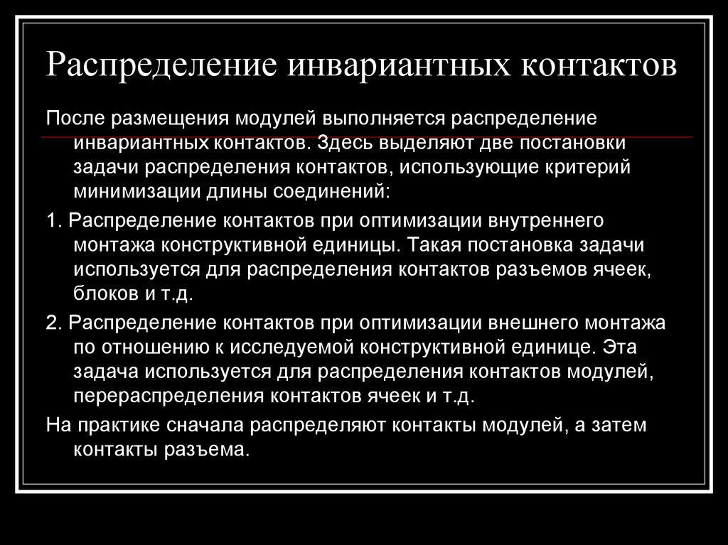 После размещения модулей выполняется распределениеинвариантных контактов. Здесь выделяют две постановки