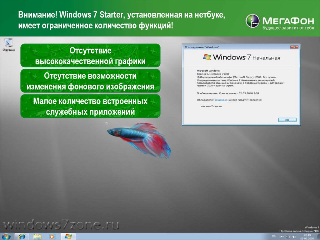 Внимание! Windows 7 Starter, установленная на нетбуке,имеет ограниченное количество функций!