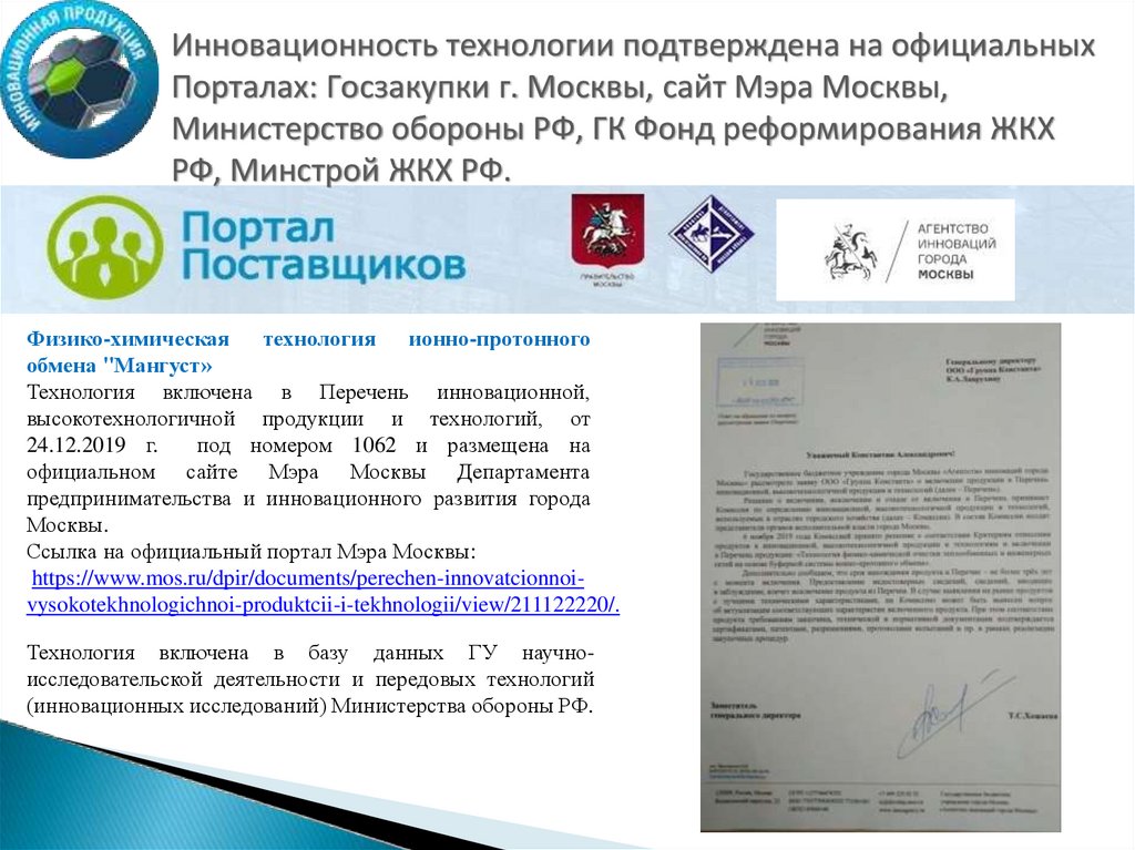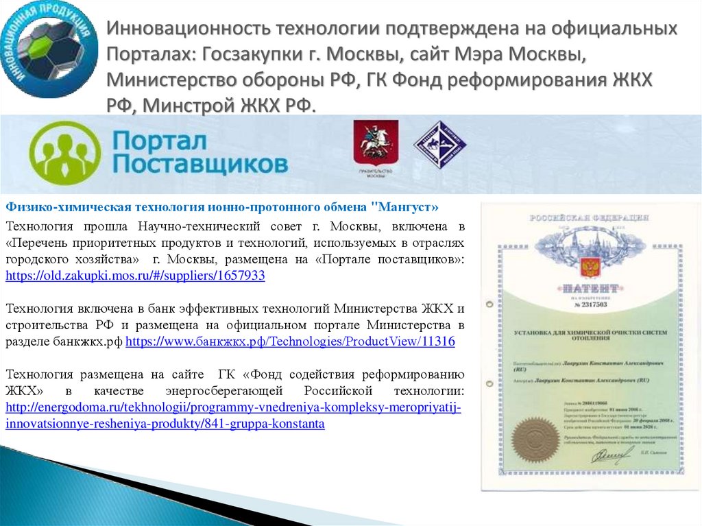 Инновационность технологии подтверждена на официальныхПорталах: Госзакупки г. Москвы, сайт Мэра Москвы,
