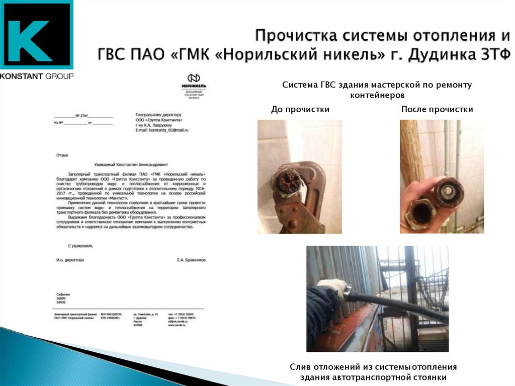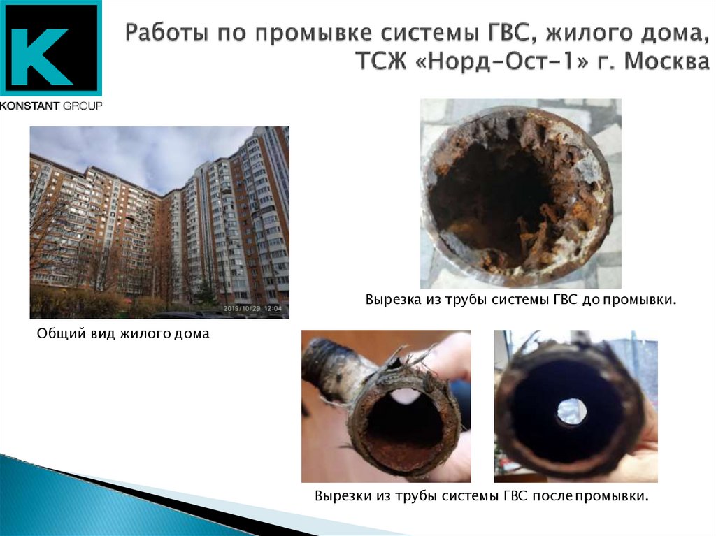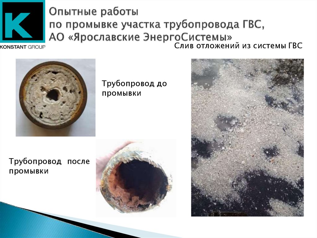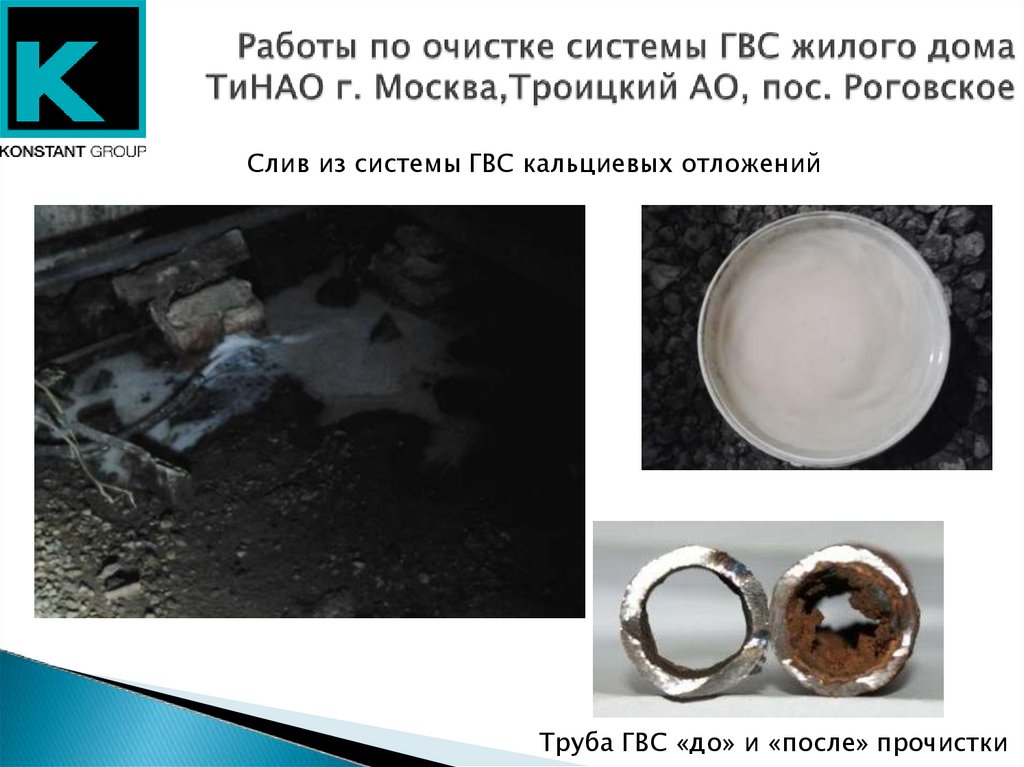 Слив из системы ГВС кальциевых отложенийТруба ГВС «до» и «после» прочистки
