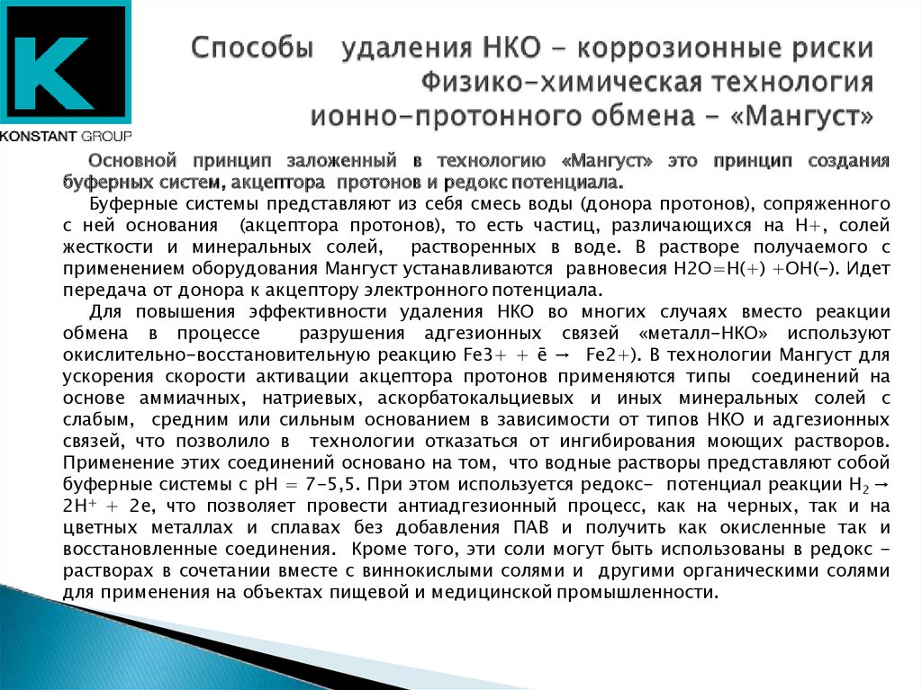 Основной принцип заложенный в технологию «Мангуст» это принцип созданиябуферных систем, акцептора протонов и редокс потенциала.