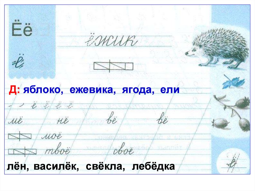 Д: яблоко, ежевика, ягода, ели