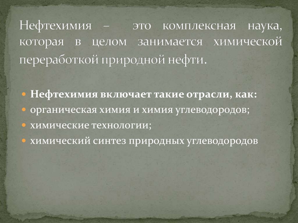 Нефтехимия включает такие отрасли, как:органическая химия и химия углеводородов;