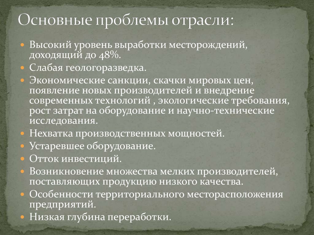 Высокий уровень выработки месторождений,доходящий до 48%.