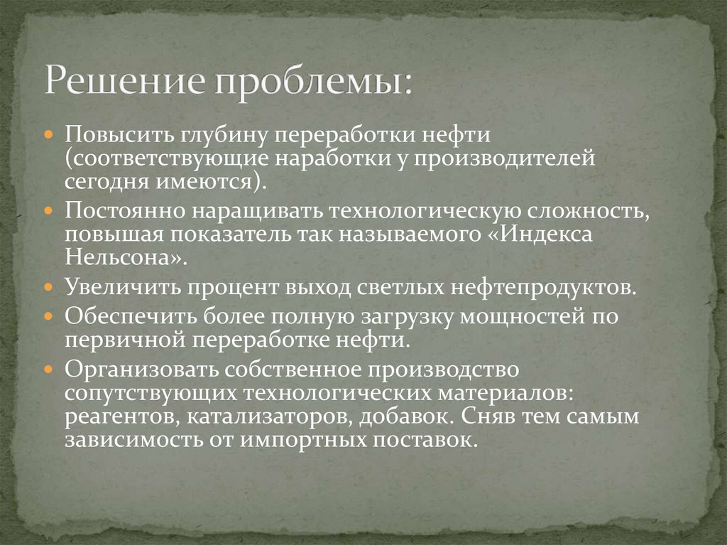 Повысить глубину переработки нефти(соответствующие наработки у производителей