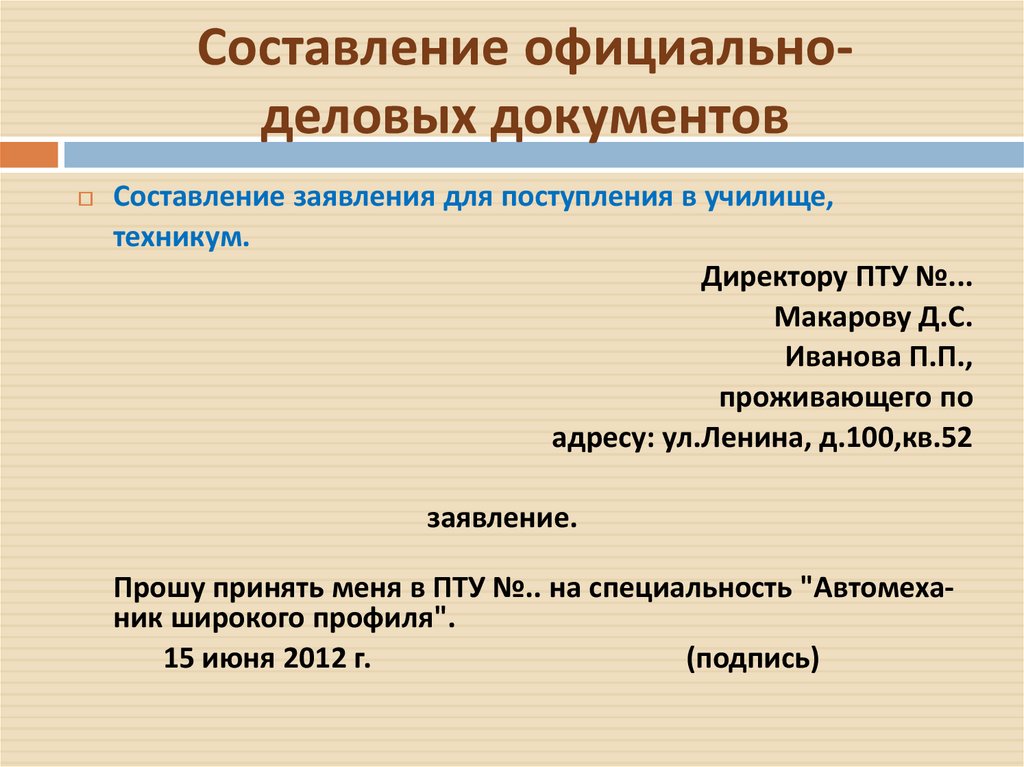 Составление официальноделовых документовСоставление заявления для поступления в училище,