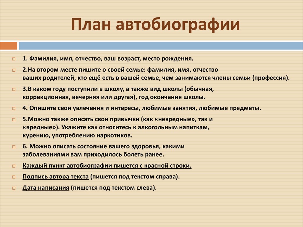 План автобиографии1. Фамилия, имя, отчество, ваш возраст, место рождения.