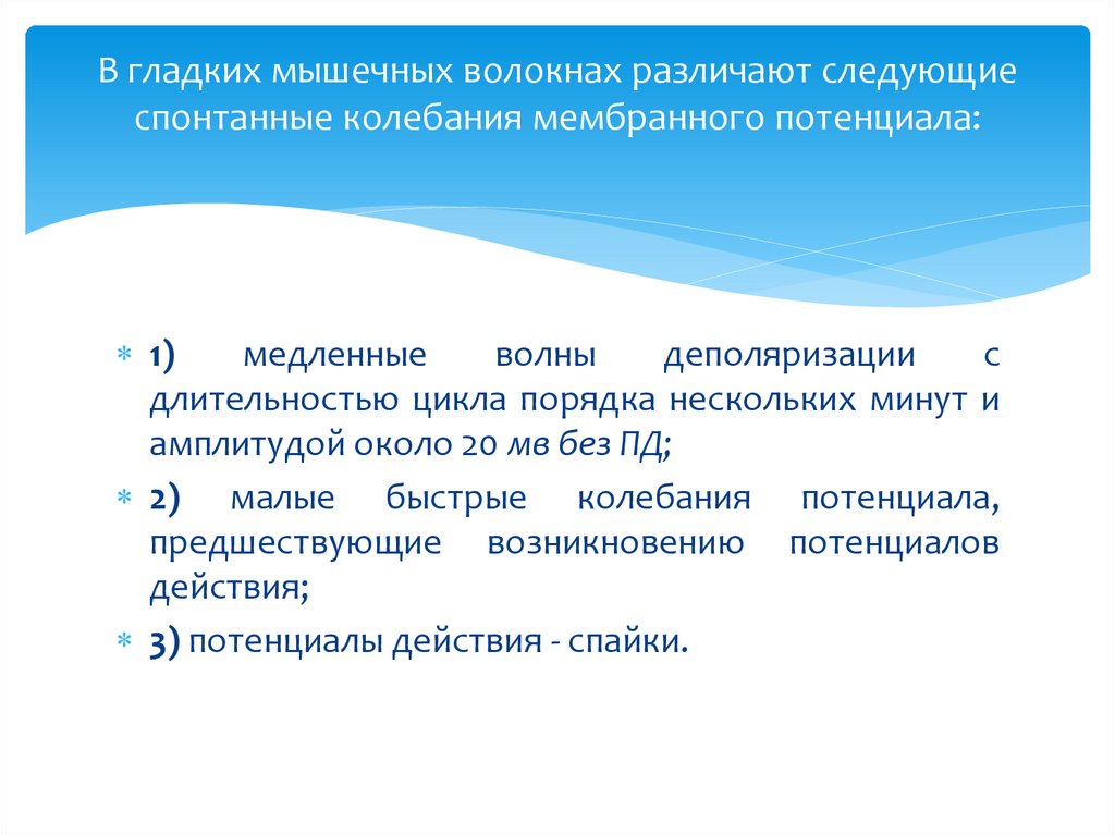 В гладких мышечных волокнах различают следующиеспонтанные колебания мембранного потенциала: