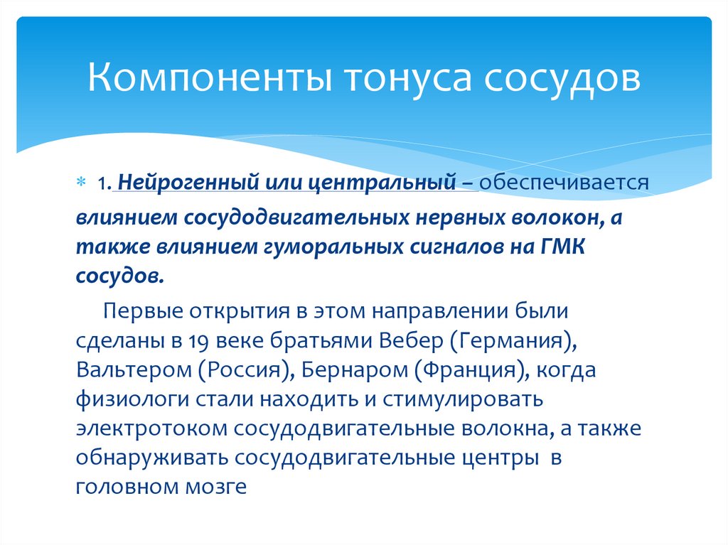 Компоненты тонуса сосудов1. Нейрогенный или центральный – обеспечивается