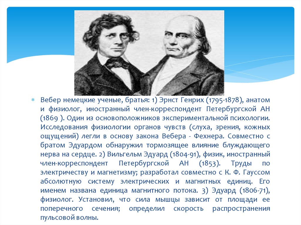 Вебер немецкие ученые, братья: 1) Эрнст Генрих (1795-1878), анатоми физиолог, иностранный член-корреспондент Петербургской АН