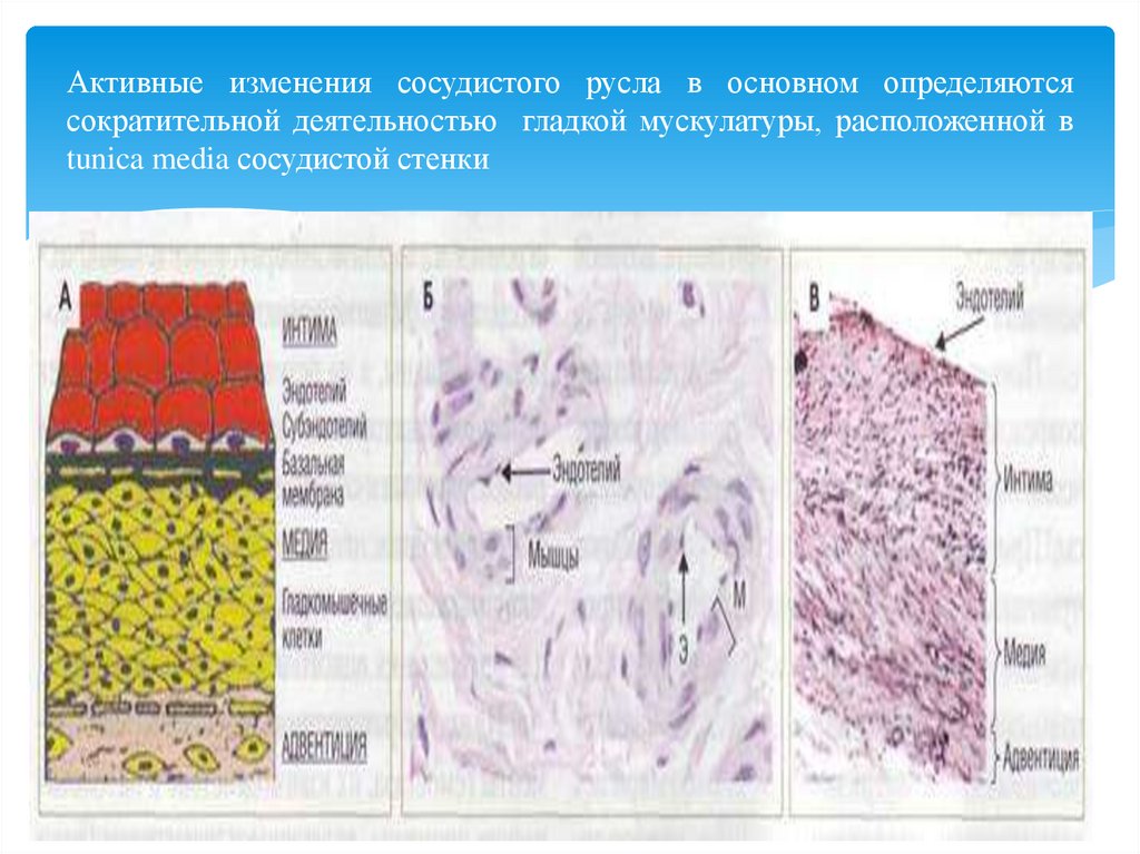 Активные изменения сосудистого русла в основном определяютсясократительной деятельностью гладкой мускулатуры, расположенной в