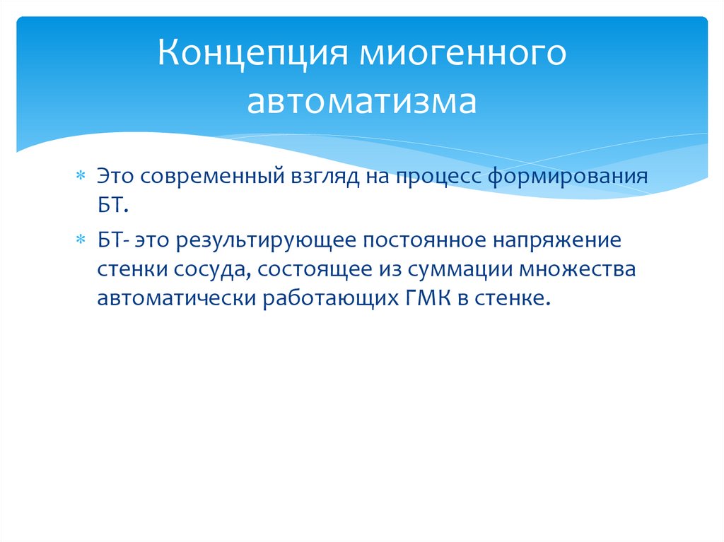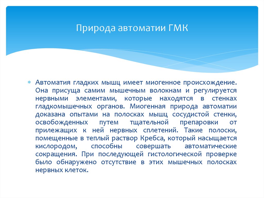 Природа автоматии ГМКАвтоматия гладких мышц имеет миогенное происхождение.