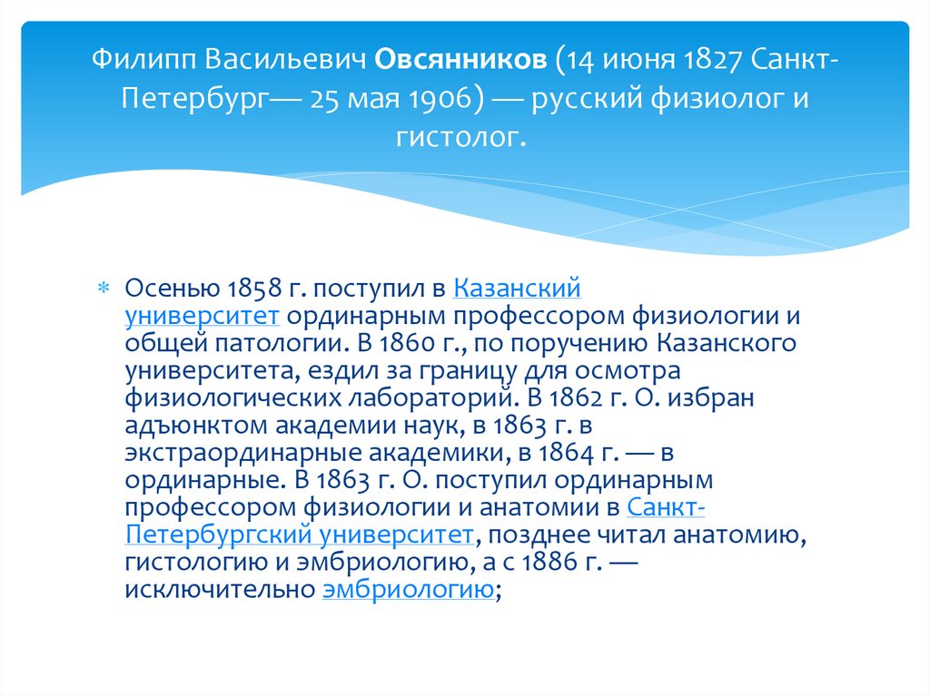 Филипп Васильевич Овсянников (14 июня 1827 СанктПетербург— 25 мая 1906) — русский физиолог игистолог.