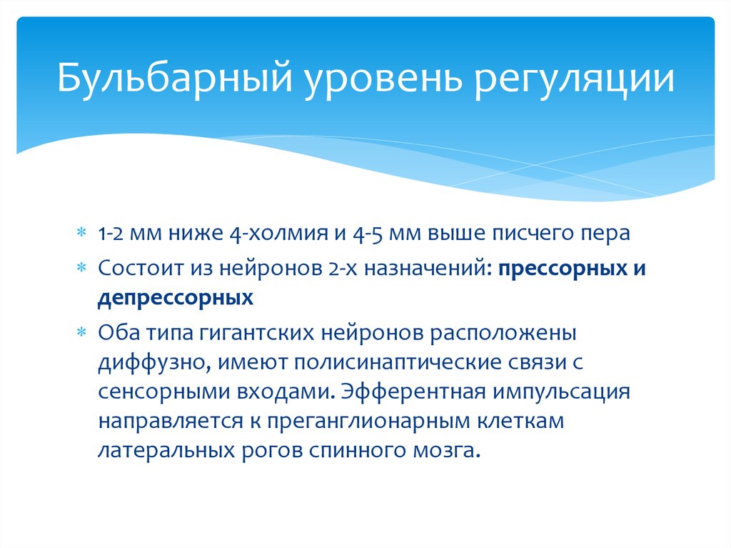Бульбарный уровень регуляции1-2 мм ниже 4-холмия и 4-5 мм выше писчего пера
