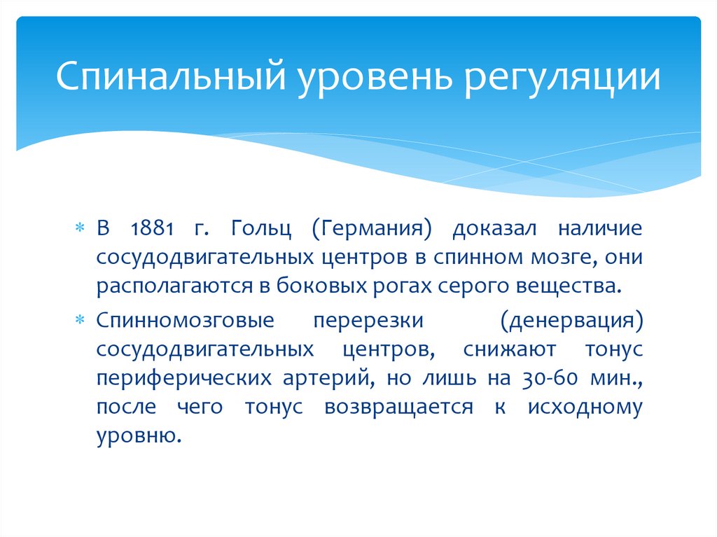 Спинальный уровень регуляцииВ 1881 г. Гольц (Германия) доказал наличие