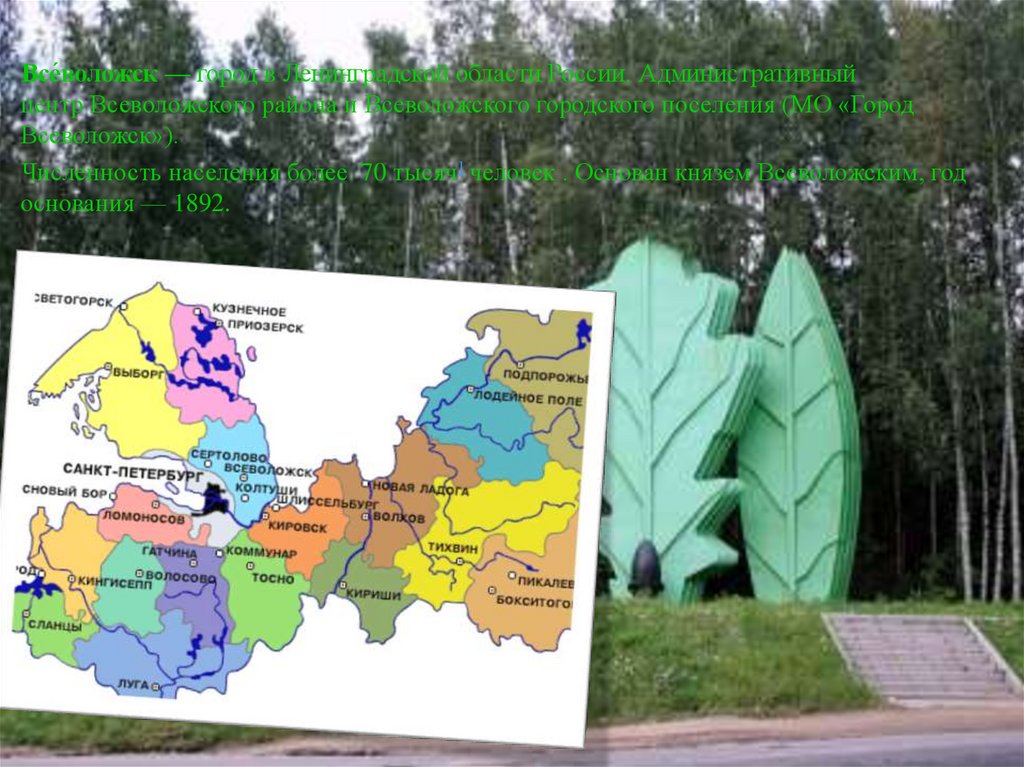 Все́воложск — город в Ленинградской области России. Административныйцентр Всеволожского района и Всеволожского городского поселения (МО «Город