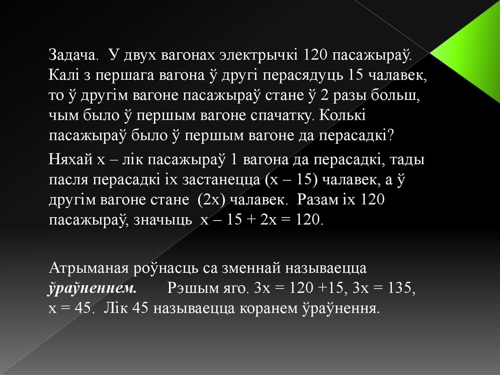 Задача. У двух вагонах электрычкі 120 пасажыраў.Калі з першага вагона ў другі перасядуць 15 чалавек,