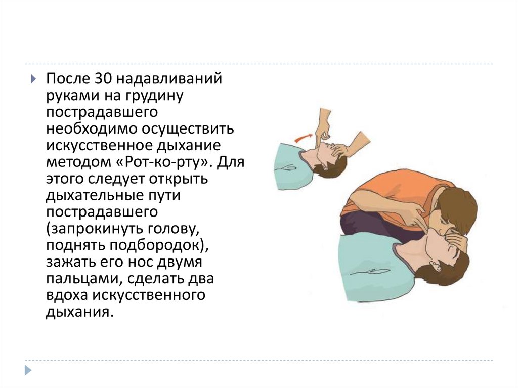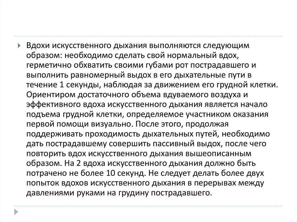 Вдохи искусственного дыхания выполняются следующимобразом: необходимо сделать свой нормальный вдох,