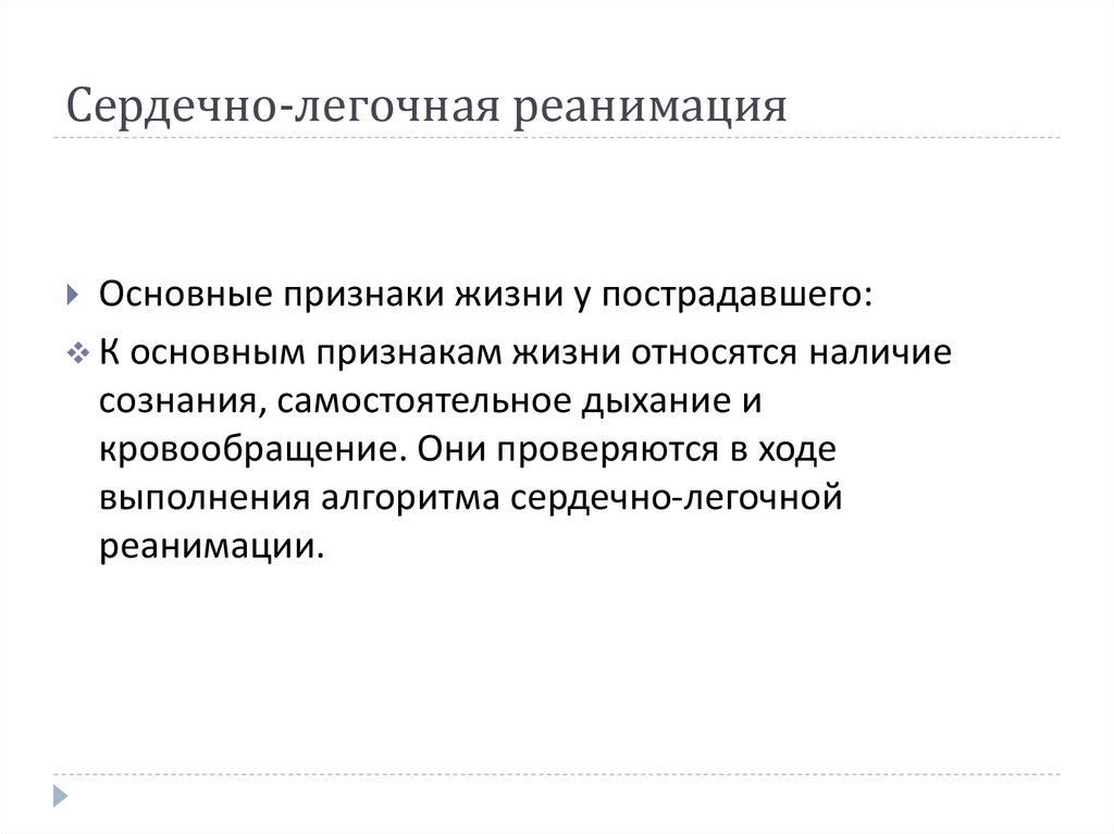 Сердечно-легочная реанимацияОсновные признаки жизни у пострадавшего: