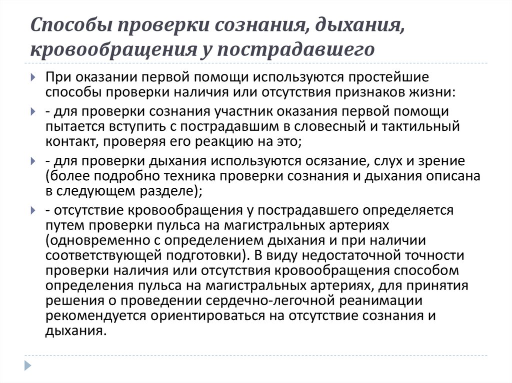 Способы проверки сознания, дыхания,кровообращения у пострадавшего