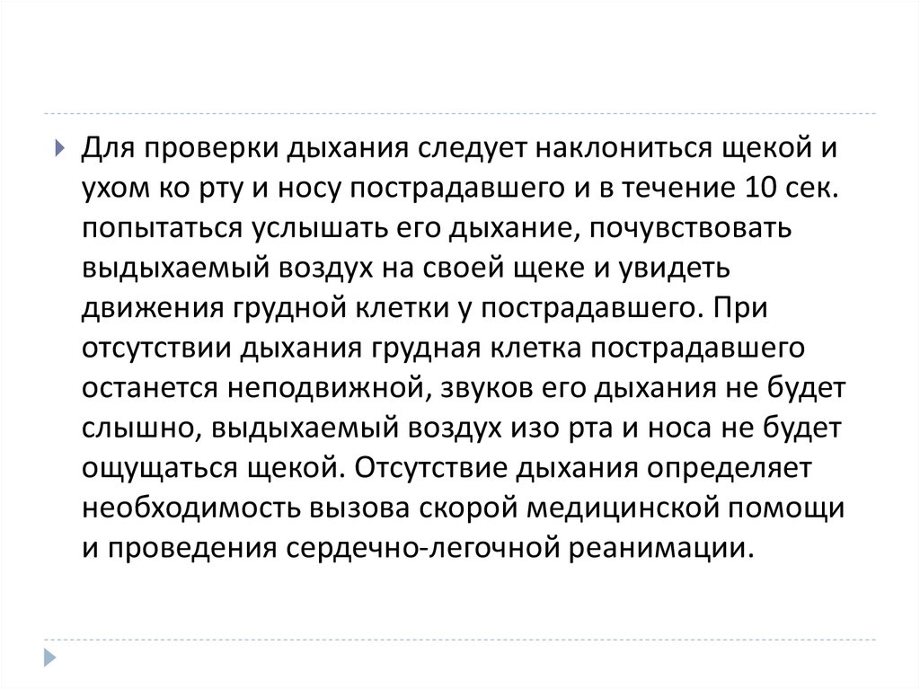 Для проверки дыхания следует наклониться щекой иухом ко рту и носу пострадавшего и в течение 10 сек.