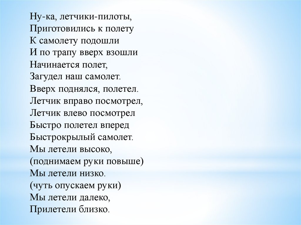 Ну-ка, летчики-пилоты,Приготовились к полету
