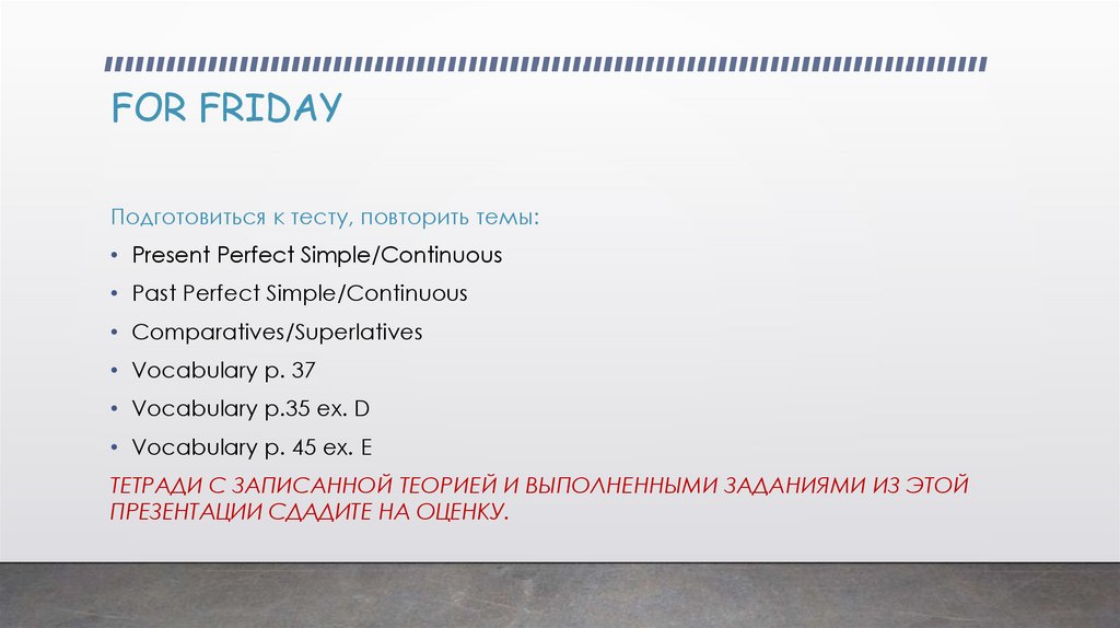 FOR FRIDAYПодготовиться к тесту, повторить темы: