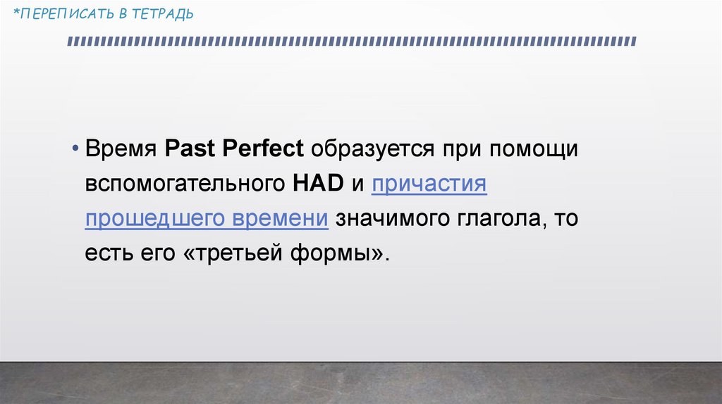 *ПЕРЕПИСАТЬ В ТЕТРАДЬ• Время Past Perfect образуется при помощи