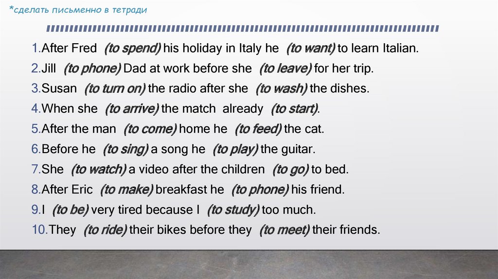 *сделать письменно в тетради1.After Fred (to spend) his holiday in Italy he (to want) to learn Italian.