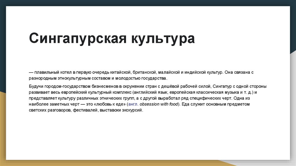 Сингапурская культура— плавильный котел в первую очередь китайской, британской, малайской и индийской культур. Она связана с