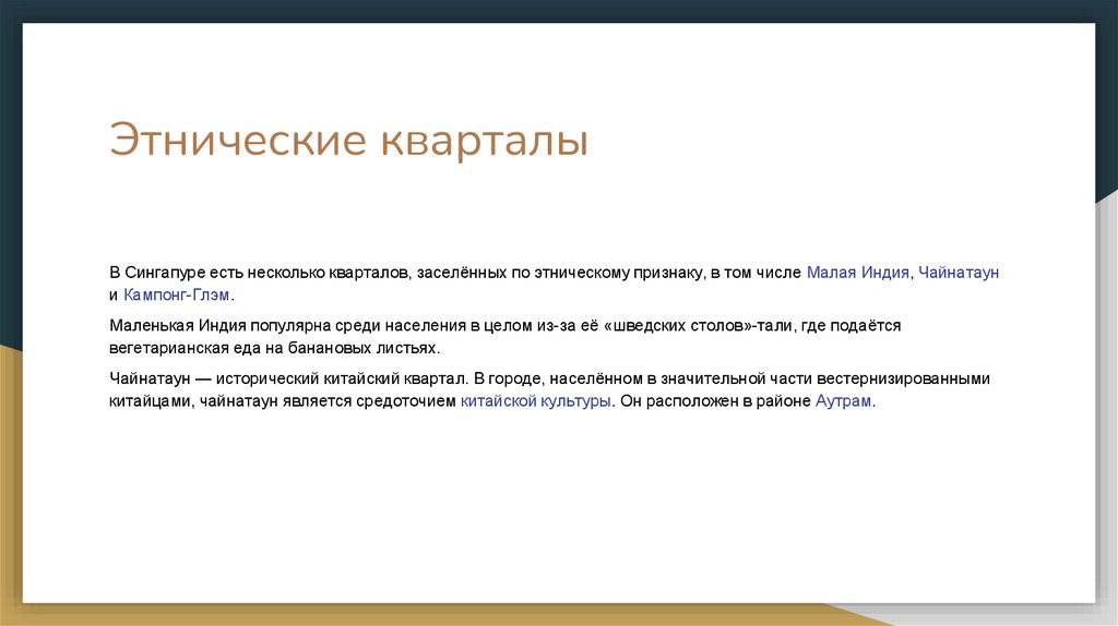 Этнические кварталыВ Сингапуре есть несколько кварталов, заселённых по этническому признаку, в том числе Малая Индия, Чайнатаун
