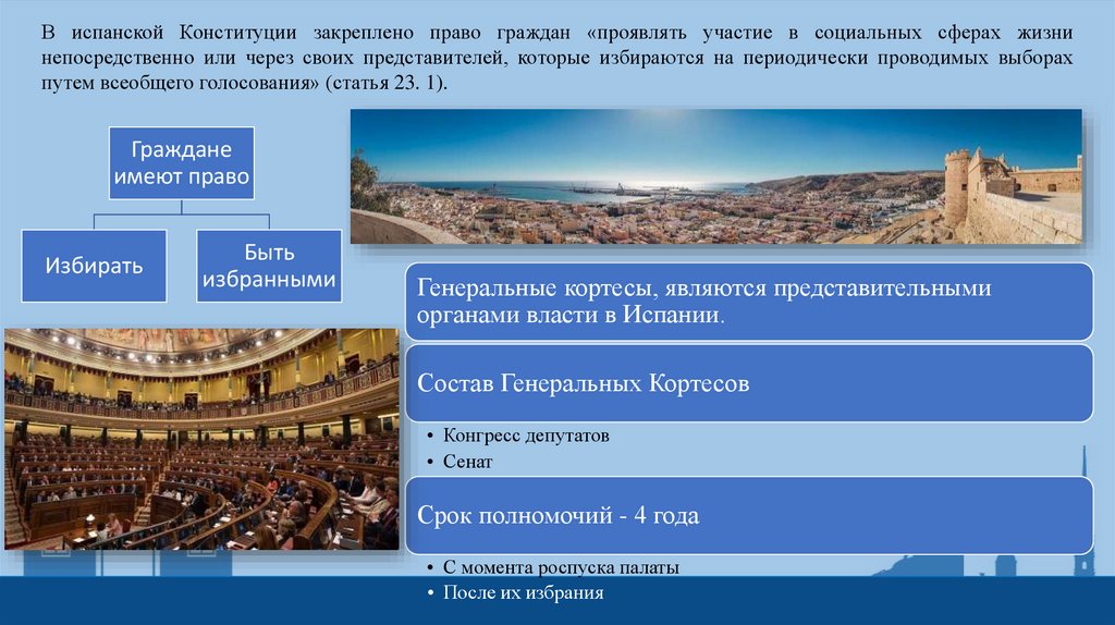 В испанской Конституции закреплено право граждан «проявлять участие в социальных сферах жизнинепосредственно или через своих представителей, которые избираются на периодически проводимых выборах