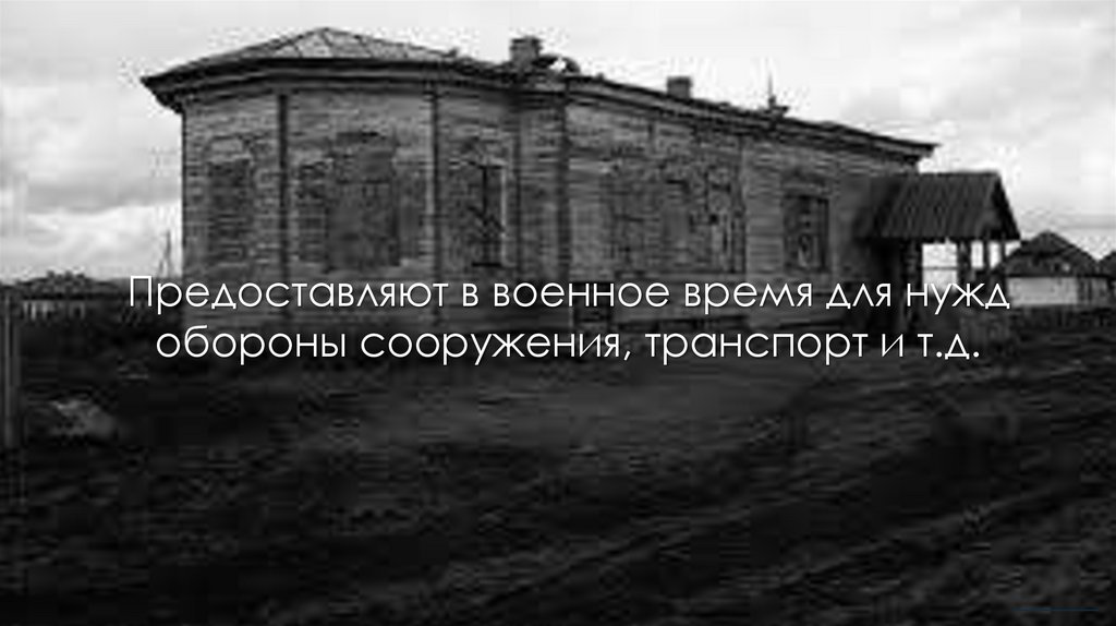 Предоставляют в военное время для нуждобороны сооружения, транспорт и т.д.